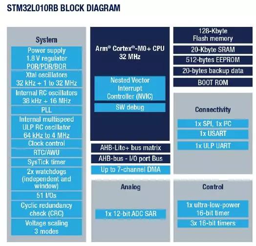 STM32L0x0 內置高達 128 KB 的 Flash、高達 20 KB 的 RAM 和高達 512 字節的片內 EEPROM。